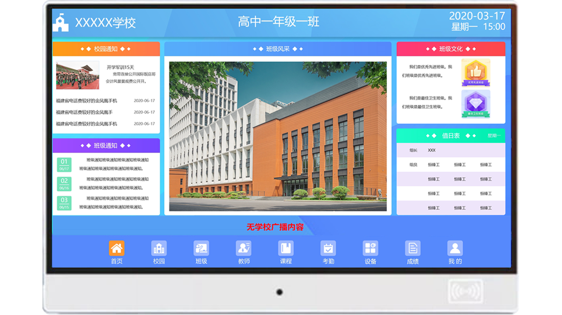 對所在班級的課程安排以及學校的作息時間的展示,讓師生合理安排時間,增強時間觀念。